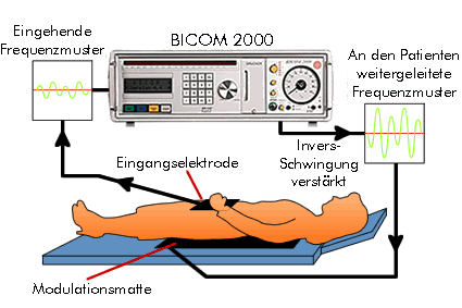 Bei der Therapie mit dem Bicom-Gerät werden Elektroden angelegt und der Patient kann entspannt sitzen oder liegen. Eine Behandlung dauert gewöhnlich zwischen 15 und 45 Minuten. Die Therapie wird als angenehm empfunden und ist völlig schmerzfrei. Das Ziel der Therapie ist es, die krankmachenden Einflüsse zu vermindern und dadurch die Kommunikation im Körper zu fördern.